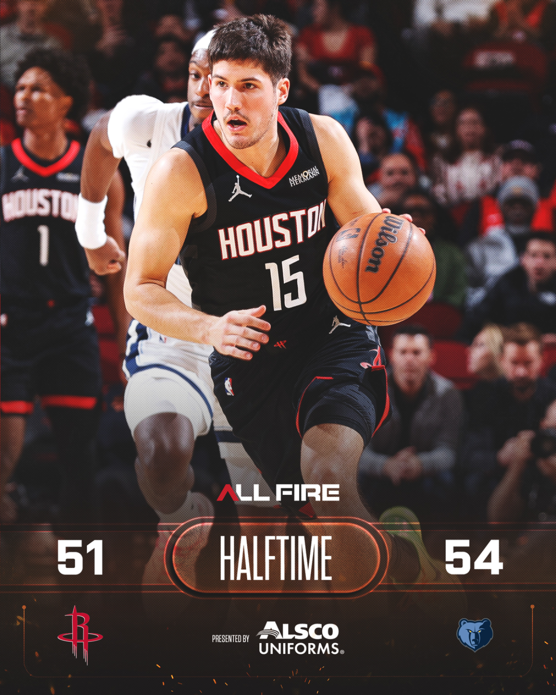 火箭队的杜兰特得到33分和8个篮板,申京得到33分、9个篮板和6次助攻,伊森得到17分和7个篮板,汤普森得到8分、8个篮板和15次助攻,史密斯得到8分和8个篮板。灰熊队的杰克逊得到17分和7个篮板,阿尔达马得到17分和7个篮板,G-杰克逊得到14分,威尔斯得到12分和6个篮板,波普得到11分,斯宾塞得到5分、5个篮板和14次助攻。